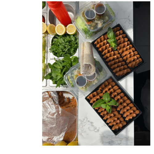 50 stuks cigkofte, 8 stuks lavash, 2 porties groente, tursu, jalapeno peper, 1 liter ayran, To Go saus en nar eksisipe